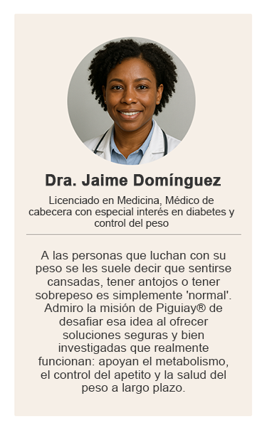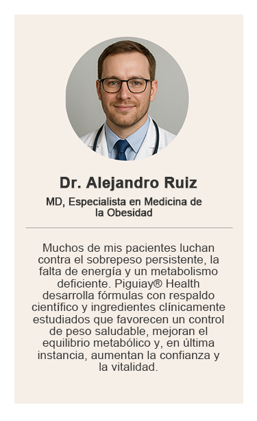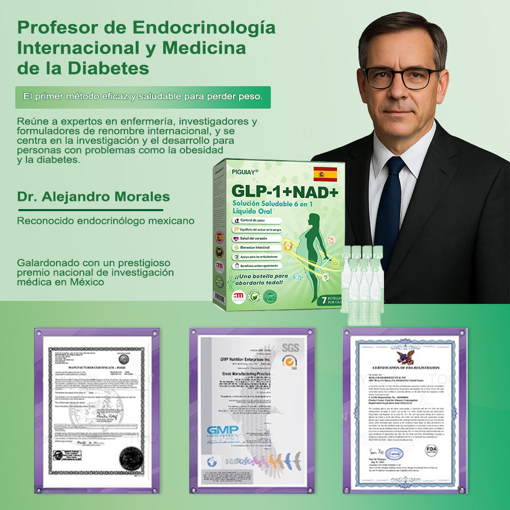 "Como endocrinรณlogo, estoy comprometido con encontrar soluciones naturales y efectivas para la salud metabรณlica y el control de peso. Despuรฉs de una investigaciรณn exhaustiva y ensayos clรญnicos con mรกs de 5,000 participantes, he comprobado que la Soluciรณn Oral GLP-1 para la Pรฉrdida de Peso de Piguiayยฎ ofrece beneficios notables para el metabolismo, el control del apetito y el bienestar general.