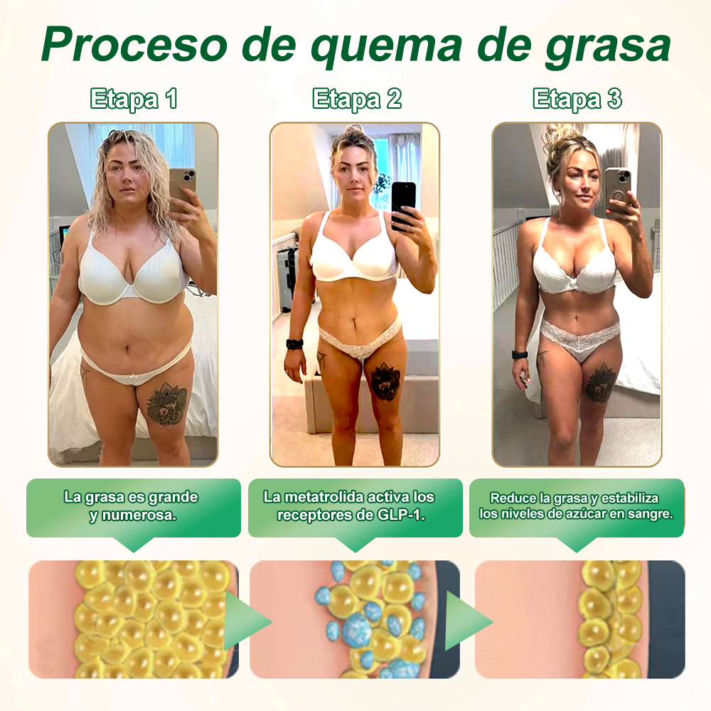 Meglutide, combinado con vinagre de manzana y el potente extracto de moringa, ayuda al cuerpo a utilizar las reservas de grasa de manera mรกs eficaz como fuente de energรญa. Al mejorar la sensibilidad a la insulina, acelera la quema de grasa, especialmente durante la restricciรณn calรณrica o el aumento de la actividad fรญsica. El vinagre de manzana ayuda a estabilizar los niveles de azรบcar en sangre, evitando que el exceso de glucosa se almacene como grasa.
